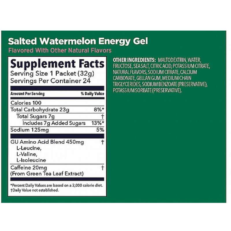 Created for daily training and competition, GU Energy Gel packs energy-dense calories in a portable packet to help sustain energy demands of any duration or activity. The 100-calorie packet contains carbohydrates (maltodextrin and fructose) that use non-competing pathways to help maximize carbohydrate absorption and utilization while diminishing stomach distress. Sodium, the primary electrolyte lost in sweat, aids in hydration by maintaining water balance. The branched-chain amino acids (leucine, valine, isoleucine) may reduce mental fatigue and decrease muscle damage.