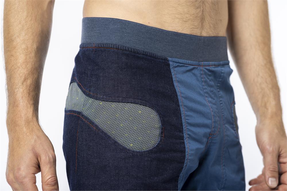 It's made of Performance Cotton or Indigo Jeans and features a distinctive pocket on the right leg, in some variants in a contrasting color, in others tone-on-tone. Comfort meets fit, with the elastic waistband and the gusseted crotch that facilitates movement.